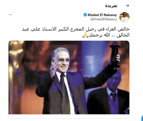 وكتب خالد النبوي عبر حسابه الرسمي بموقع التدوينات القصيرة تويتر: “خالص العزاء في رحيل المخرج الكبير الاستاذ علي عبد الخالق.. الله يرحمك”.