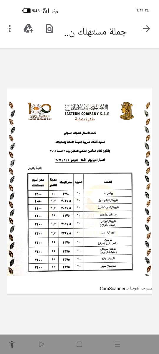 وأعلنت الشركة الشرقية إيسترن كومباني عن قائمة الأسعار لمنتجات السجائر، والتي تطبق اعتبارًا من غدًا، الأحد، 4 سبتمبر، والتي جاءت كالتالي: