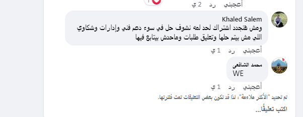 وقال عميل المصرية للاتصالات عبر صفحة الشركة الرسمية على موقع "فيسبوك"، :"ومش هنجدد اشتراك لحد لمه نشوف حل في سوء دعم فني وإدارات وشكاوي اللي مش بيتم حلها وتعليق طلبات وماحدش بيتابع فيها".