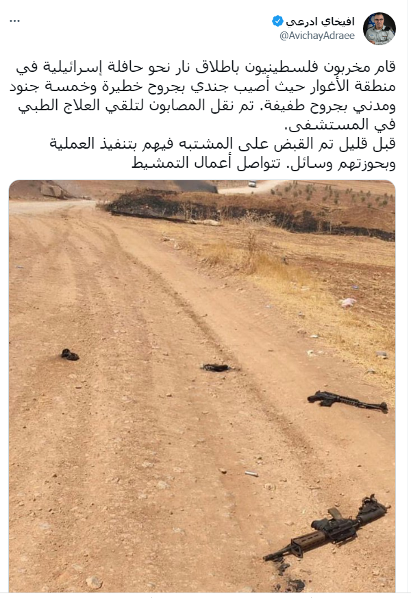 وذكر المتحدث باسم الجيش الإسرائيلى للأعلام العربي افيخاي ادرعي فى تغريدة له عبر حسابه الرسمي على تويتر أن :" مجموعة من المسلحين الفلسطينين قاموا باطلاق نار تجاه حافلة إسرائيلية فى منطقة الأغوار حيث اصيب جندى بجروح خطيرة وخمسة جنود آخرين ومستوطن مدني بجروح طفيفة، وتم نقل المصابين إلى المستشفى من أجل تلقى العلاج".