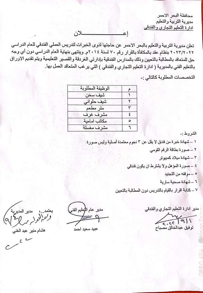 وظائف خالية بالمدارس الفندقية بمحافظة البحر الأحمر، وذلك بعد أن أعلنت مديرية التربية والتعليم بالبحر الأحمر عن حاجتها لذوي الخبرات لتدريس العملي الفندقي للعام الدراسي 2022/2023.