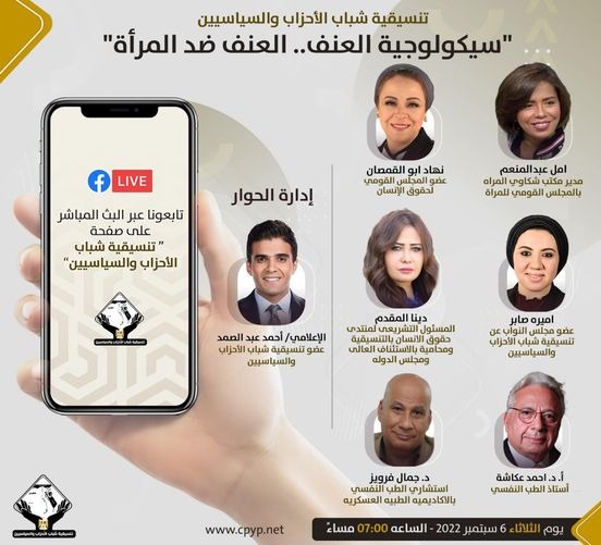 ينظم صالون تنسيقية شباب الأحزاب والسياسيين جلسة نقاشية بعنوان "سيكولوجية العنف.. العنف ضد المرأة"، في الـ7 مساء الثلاثاء المقبل.