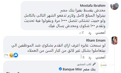 علق عميل بنك مصر على صفحة المصرف الرسمية على موقع "فيسبوك"، : "محدش يقسط بفيزا بنك مصر، بينزلوا المبلغ كامل ولازم تدفعو الشهر التالى بالكامل".