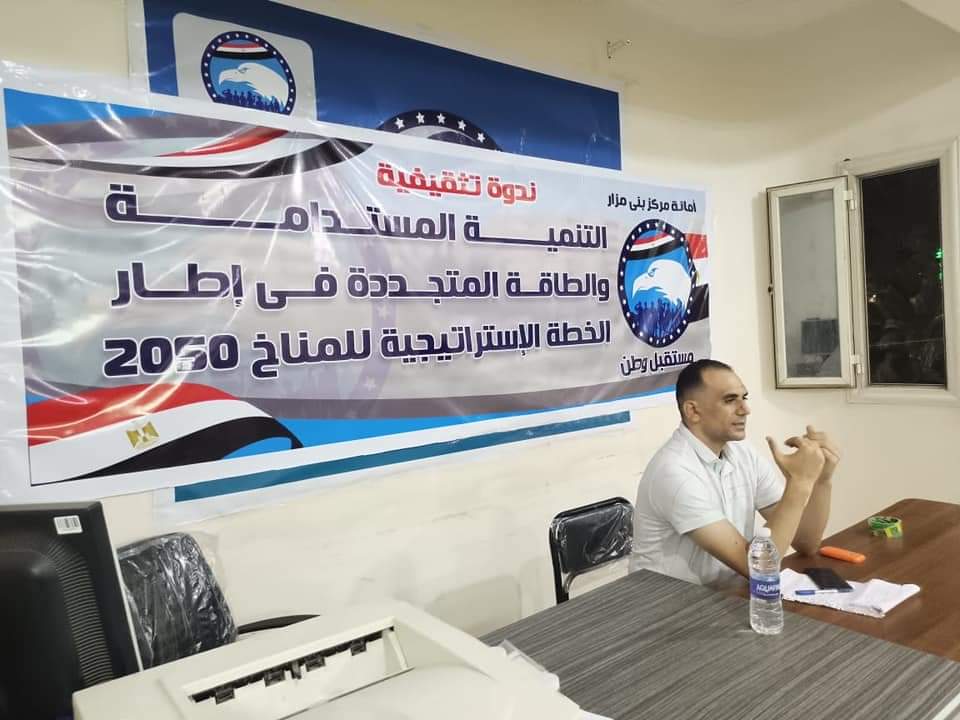 كما نظمت أمانة مركز بني مزار، ندوة تثقيفية حول المتغيرات المناخية، والتي جاءت تحت عنوان "التنمية المستدامة والطاقة المتجددة في إطار الخطة الإستراتيجية لمناخ مصر 2050"،