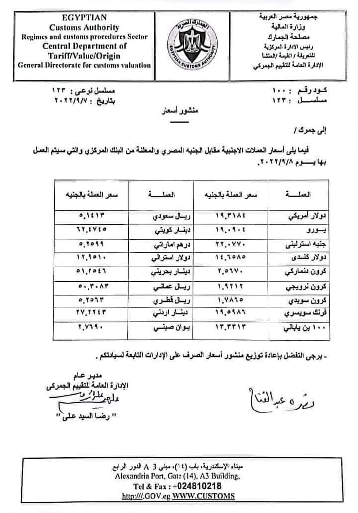 قررت وزارة المالية رفع سعر الدولار الجمركي إلى 19.31 جنيه بداية من اليوم الخميس.