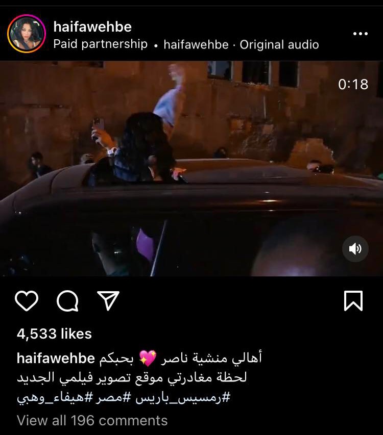 ونشرت هيفاء وهبي مقطع من ترحيب الأهالي بها، وذلك بعد صعودها لسيارتها بعد الإنتهاء من تصوير مشاهدها هناك، وعلقت: أهالي منشية ناصر.. بحبكم.. لحظة مغادرتي موقع تصوير فيلمي الجديد.