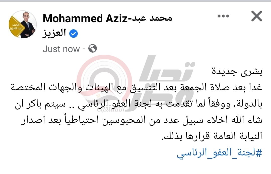 قال النائب محمد عبد العزيز، عضو لجنة العفو الرئاسى، أنه وفقا لما تقدمت به اللجنة، سنكون أمام مجموعة جديدة من المفرج عنهم والمحبوسين على ذمة قضايا بشكل احتياطى وذلك بعد صلاة الجمعة غدا.