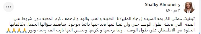 وكتبت شافكي المنيري عبر فيسبوك: توفيت عمتي الكريمة السيدة رجاء المنيري الطيبة، والحب والود والرحمة وكرم المحبة دون شروط، هي العمة التي تحبك طول الوقت حتى وإن غبنا عنها تجد حبها دائمًا موجود.. سأفتقد سؤالها الجميل ومكالماتها الحلوة في الاطمئنان عليّ طول الوقت.. ربنا يرحمها ويكرمها ويحسن إليها يا رب ألف رحمة ونور.