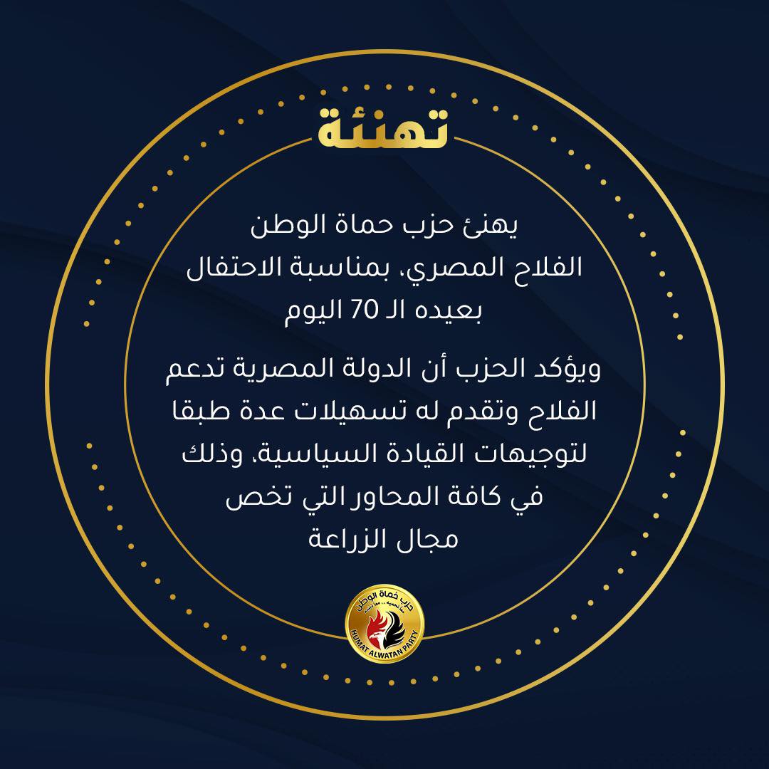 قدم حزب حماة الوطن، اليوم، التهنئة للفلاح المصري بمناسبة الاحتفال عيده الـ 70.
