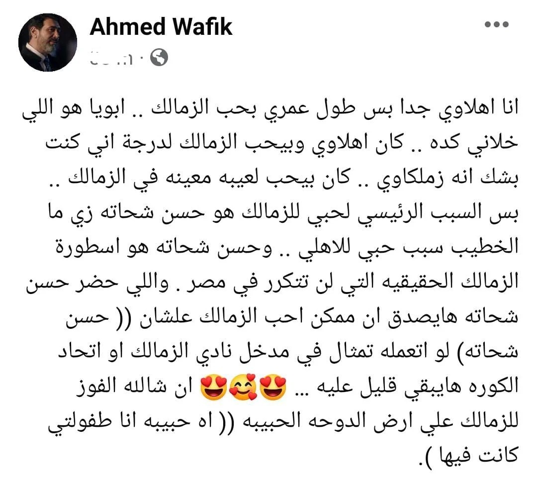 وكتب أحمد وفيق عبر حسابه الرسمي بموقع التواصل الإجتماعي فيسبوك: أنا أهلاوي جدًا بس طول عمري بحب الزمالك، أبويا هو اللي خلاني كده، كان أهلاوي وبيحبها وكان بيحب لاعيبة معينة في الزمالك.. بس السبب الرئيسي لحبي للزمالك هو حسن شحاتة زي ما الخطيب سبب حبي للأهلي.
