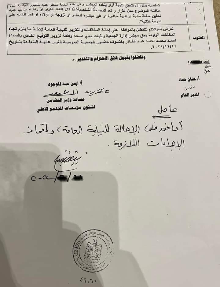 وافق مساعد وزير التضامن لشئون مؤسسات المجتمع المدني، على إحالة مجدي عبد الغني، إلى النيابة العامة لاستيلاءه على أموال جمعية المحترفين وإجراء عملية تغيير مفصل فى ألمانيا على حساب الجمعية وشراء مقر الجمعية بالعجوزة أعلى من سعرها الحقيقى والحصول على تحويلات جمعية المحترفين الدولية دون وجهه حق وشراء مستلزمات رياضية من محل ابنته.