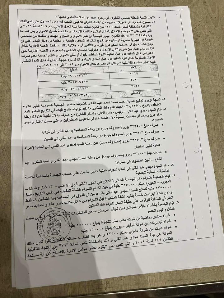 وكشفت الحقيقات عن حصول الجمعية على تحويلات سنوية من الاتحاد الدولي للاعبين المحترفين دون الحصول على المموافقات القانونية ، بالمخالفة لنص المادة 27 من قانون تنظيم ممارسة العمل الأهلي، والتي تنص على " مع عدم الإخلال بأحكام قوانين مكافحة الإرهاب وغسل الأموال، يكون للجمعية في سبيل تحقيق أغراضها ودعم مواردها المالية، حق تلقي الأموال النقدية من داخل الجمهورية من أشخاص طبيعية أو اعتبارية مصرية أو منظمات أجنبية غير حكومية مصرح لها بالعمل داخل مصر وفقاً لأحكام هذا القانون، علي أن تودع تلك الأموال في حسابها البنكي و التأشير في سجلاتها بذلك، وأن تقوم الجمعية بتخصيص وإنفاق تلك الأموال فيما وردت من أجله مع تقديم كشوف حساب دورية وتقرير فني يستوفي أوجه الإنفاق والنشاط، ويجب إخطار الجهة الإدارية بتلقي الأموال في المواعيد التي تحددها اللائحة التنفيذية، كما تبين هذه اللائحة ضوابط و إجراءات تلقي الأموال العينية والحد الأقصى لقيمة تلقي الأموال النقدية".