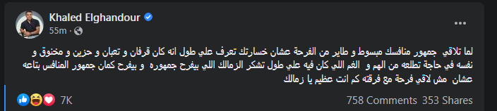 وكتب خالد الغندور عبر حسابة الرسمي"فيس بوك:" لما تلاقي جمهور منافسك مبسوط ،و طايرمن الفرحة عشان خسارتك تعرف علي طول انه كان قرفان و تعبان و حزين و مخنوق و نفسه في حاجة تطلعه من الهم و الغم اللي كان فيه علي طول تشكر الزمالك اللي بيفرح جمهوره ، و بيفرح كمان جمهور المنافس بتاعه عشان مش لاقي فرحة مع فرقته كم انت عظيم يا زمالك.