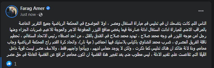 وكتب فرج عامر عبر "فيس بوك:"الناس اللي كانت بتضحك ان في تدليس في مباراة السنغال ومصر ، اولا الموضوع في المحكمة الرياضية جميع التقرير الخاصة بالمراقب الامني للمباراة ادانت السنغال ادانة صارخة فيما يخص مدافع الليزر المدفوعة الاجر والموجة للاعبي ضربات الجزاء ومنها رجل امن موجه الليزر في وجه محمد صلاح تهديد محمد صلاح في الفندق بالقتل ، من احد اصدقاء رئيس الاتحاد السنغالي.