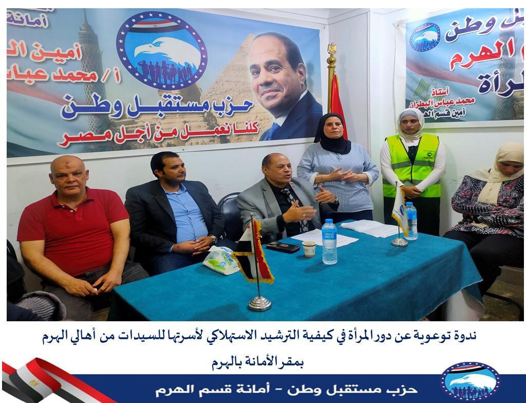 كما نظمت أمانة قسم الهرم، ندوة توعوية حول دور المرأة في تعزيز ثقافة الترشيد الاستهلاكي.