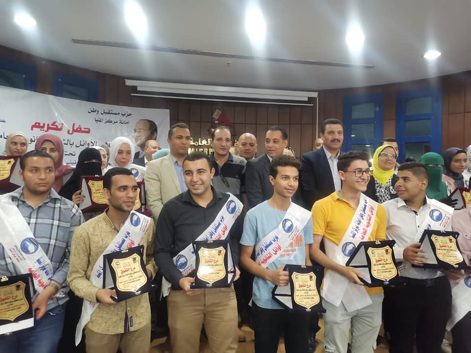 وفي محافظة المنيا،نظمت أمانة مركز المنيا، احتفالية كبري لتكريم اوائل الثانوية العامة علي مستوي دائرة مركز المنيا والبالغ عددهم 38 طالب وطالبة، وبحضور القيادات التنظيمية للحزب، وعدد من أعضاء مجلسي النواب والشيوخ، وقيادات التربية والتعليم وأولياء الأمور، في مكتبة مصر العامة، وشهدت الاحتفالية تقديم بعض الفقرات الفنية وتقديم الدروع للطلبة المتفوقين وسط فرحة من الطلاب وأولياء الأمور.