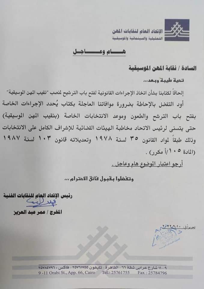 وجاء نص البيان كالآتي: السادة نقابة المهن الموسيقية إلحاقا لكتابنا بشأن اتخاذ الإجراءات القانونية لفتح باب الترشيح لمنصب نقيب المهن الموسيقية أود التفضل بالإحاطة بضرورة موافاتنا العاجلة بكتاب يحدد الإجراءات الخاصة بفتح باب الترشح والطعون وموعد الانتخابات الخاصة بالنقيب.