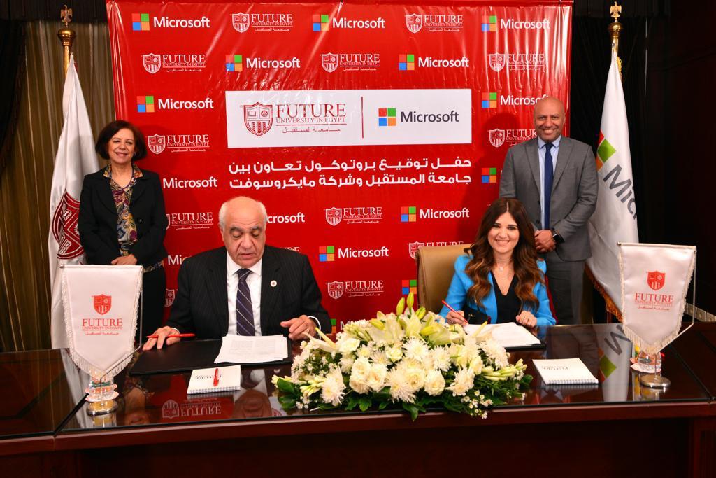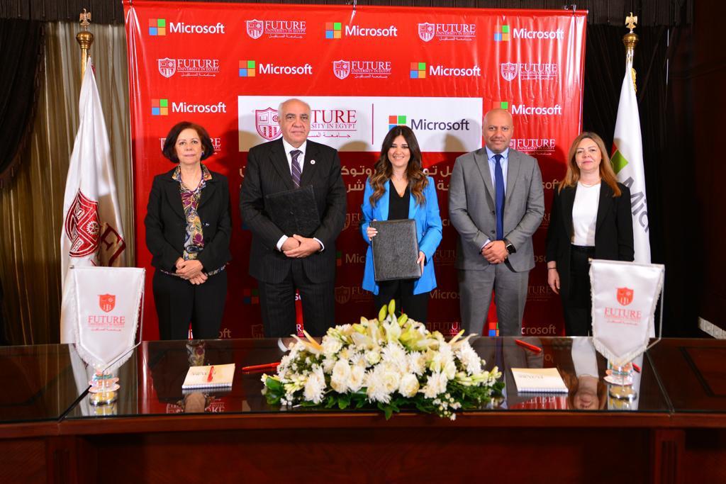 وشهد الدكتور خالد عزازى رئيس مجلس أمناء جامعة المستقبل توقيع الاتفاقية .ووقع الاتفاقية عن جامعة المستقبل الدكتور عبادة سرحان ، رئيس جامعة المستقبل وعن شركة ميكرو سوفت ميرنا عارف ، مدير عام شركة ميكروسوفت مصر. وبحضور كل من عمرو المصرى مدير قطاع التعليم بشركة ميكروسوفت مصر و الدكتورة نيفين راجى ، نائب رئيس الجامعة لشئون التعليم والطلاب والدكتور محمود سامى ، بكلية الحاسبات وتكنولوجيا المعلومات ومدير مركز ضمان ضمان الجودة والتطوير المستمر بجامعة المستقبل.