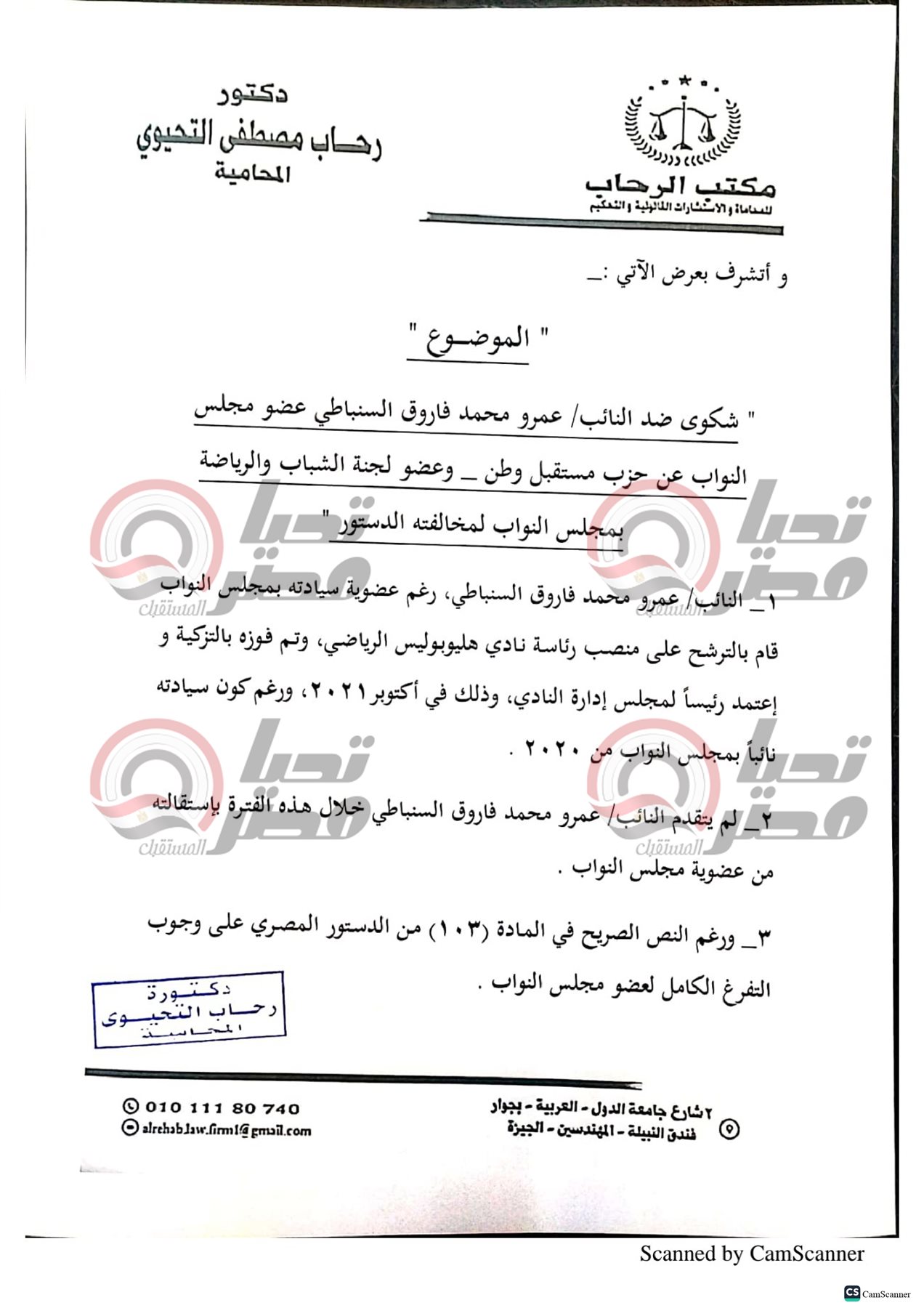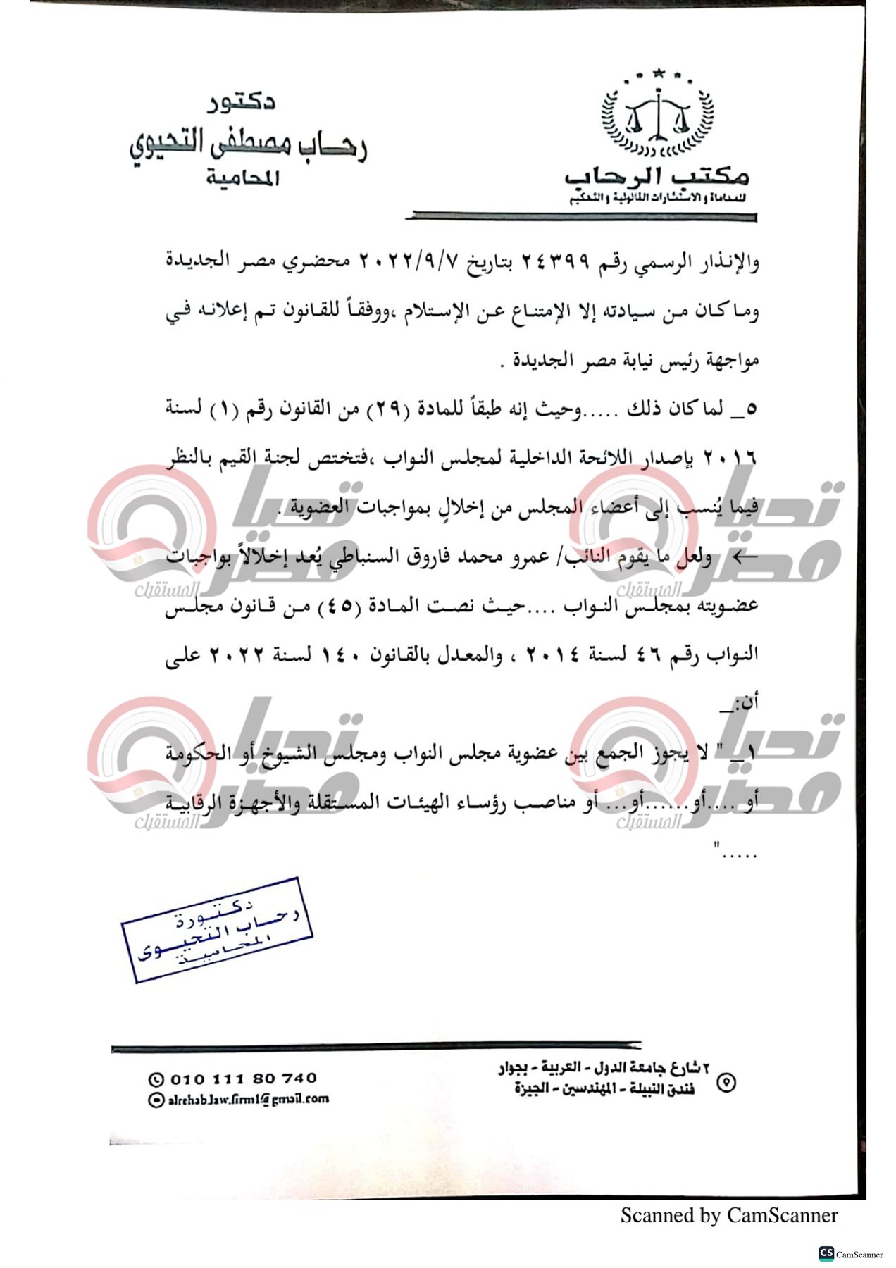 تحرك جديد بشأن إنذار النائب عمرو السنباطى لجمعه بين عضوية البرلمان ورئاسة هيئه رياضية