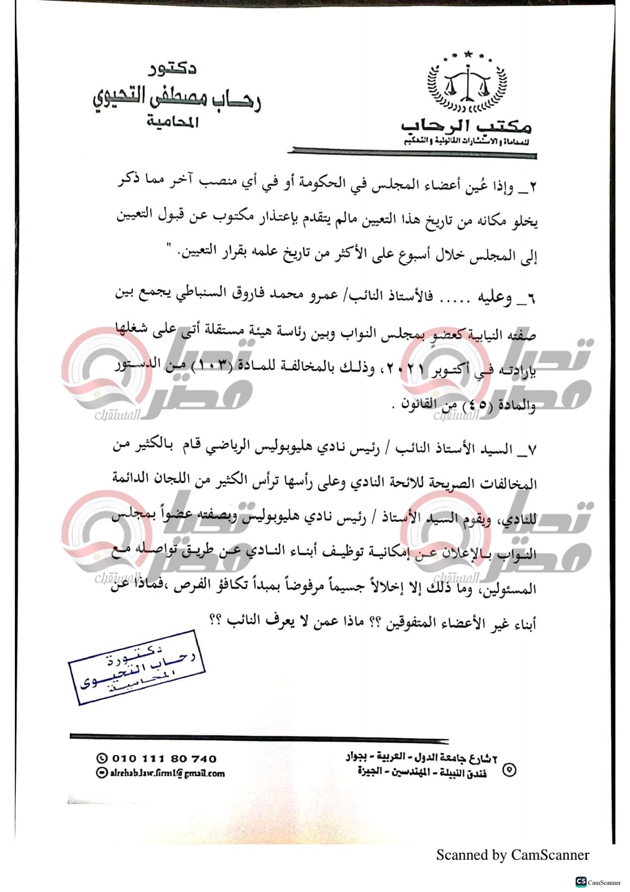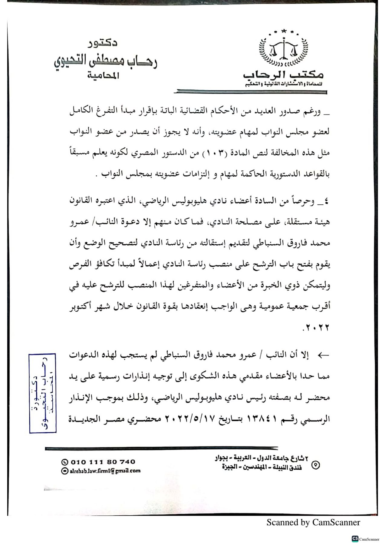 أعلن عدد من أعضاء نادى هليوبوليس، تقدمهم بخطاب رسمى لمجلس النواب، برئاسة المستشار الدكتور حنفى جبالى بشأن الإنذار الخاص بالنائب عمرو السنباطى، عضو مجلس النواب، بعد جمعه لعضوية مجلس النواب، ورئاسة هيئة رياضية مستقلة بالمخالفة لصحيح القانون، والأحكام القضائية الصادر فى هذا الشأن والتى تمنع وتحظر الجمع بين أى من العمل البرلمانى أو العمل النقابى أو العمل الرياضى وذلك تحقيقا لنصوص الدستور التى تؤكد أهمية التفرغ الكامل من جانب أعضاء السلطة التشريعية لأداء مهمتهم البرلمانية السامية.