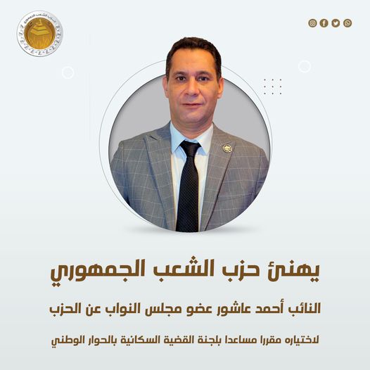 هنأ حزب الشعب الجمهوري النائب أحمد عاشور عضو مجلس النواب عن الحزب، لاختياره مقررا مساعدا بلجنة القضية السكانية بالحوار الوطني.