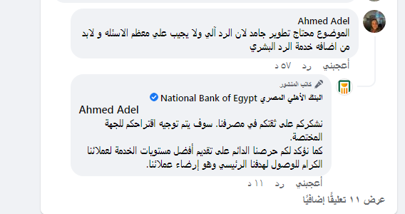 قال عميل البنك الاهلى المصرى عبر صفحته الرسمية على موقع "فيسبوك"،: "الموضوع محتاج تطوير جامد لأن الرد آلي لا يجيب على معظم الأسئلة ولابد من اضافه خدمة الرد البشري".