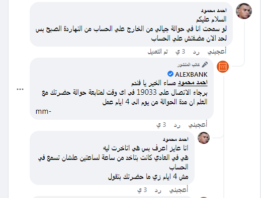 علق عميل بنك الاسكندرية على صفحة المصرف الرسمية على موقع "فيسبوك"،: "لو سمحت أنا في حوالة جيالي من الخارج علي الحساب من النهاردة الصبح بس لحد الان مضفتش علي الحساب".