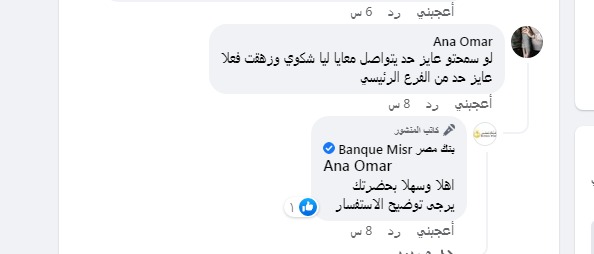قال عميل بنك مصر عبر صفحة المصرف الرسمية على موقع "فيسبوك"، :لو سمحتوا عايز حد يتواصل معايا ليا شكوي وزهقت فعلا".