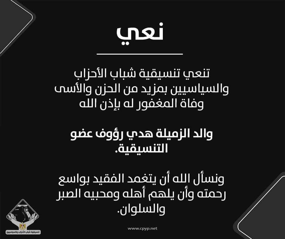 نعت تنسيقية شباب الأحزاب والسياسيين، بمزيد من الحزن والأسى وفاة المغفور له بإذن الله والد هدي رؤوف عضو التنسيقية.