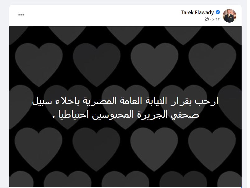 قال المحامي طارق العوضي عضو لجنة العفو الرئاسي، عبر حسابة الشخصي الفيس بوك": ارحب بقرار النيابة العامة، باخلاء سبيل صحفي الجزيرة المحبوسين احتياطيا".