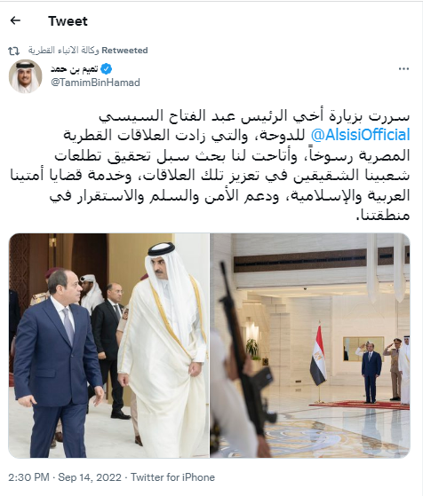 وكتب أمير قطر في تغريدة له على “تويتر”: «سررت بزيارة أخي الرئيس عبد الفتاح السيسي للدوحة، والتي زادت العلاقات القطرية المصرية رسوخاً، وأتاحت لنا بحث سبل تحقيق تطلعات شعبينا الشقيقين في تعزيز تلك العلاقات، وخدمة قضايا أمتينا العربية والإسلامية، ودعم الأمن والسلم والاستقرار في منطقتنا».
