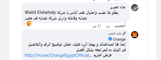 علق عميل orange اورنج عبر صفحة الشركة الرسمية على موقع "فيسبوك"، : "بطلو بقا نصب واحتيال على الناس يا شركة نصابة وفاشله وازبل شركة نصابة فى مصر".