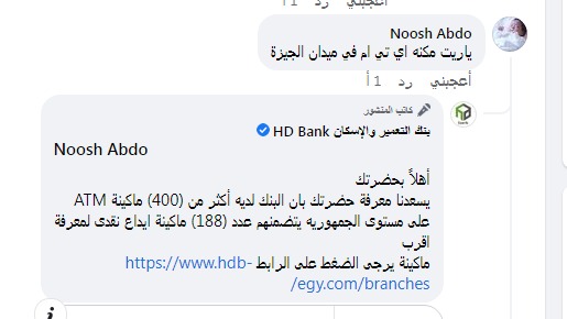 رد موظف خدمة العملاء في على صفحة مصرف بنك التعمير والاسكان قائلاً: "البنك لديه أكثر من (400) ماكينة ATMعلى مستوى الجمهوريه يتضمنهم عدد (188) ماكينة إيداع نقدى لمعرفة أقرب".
