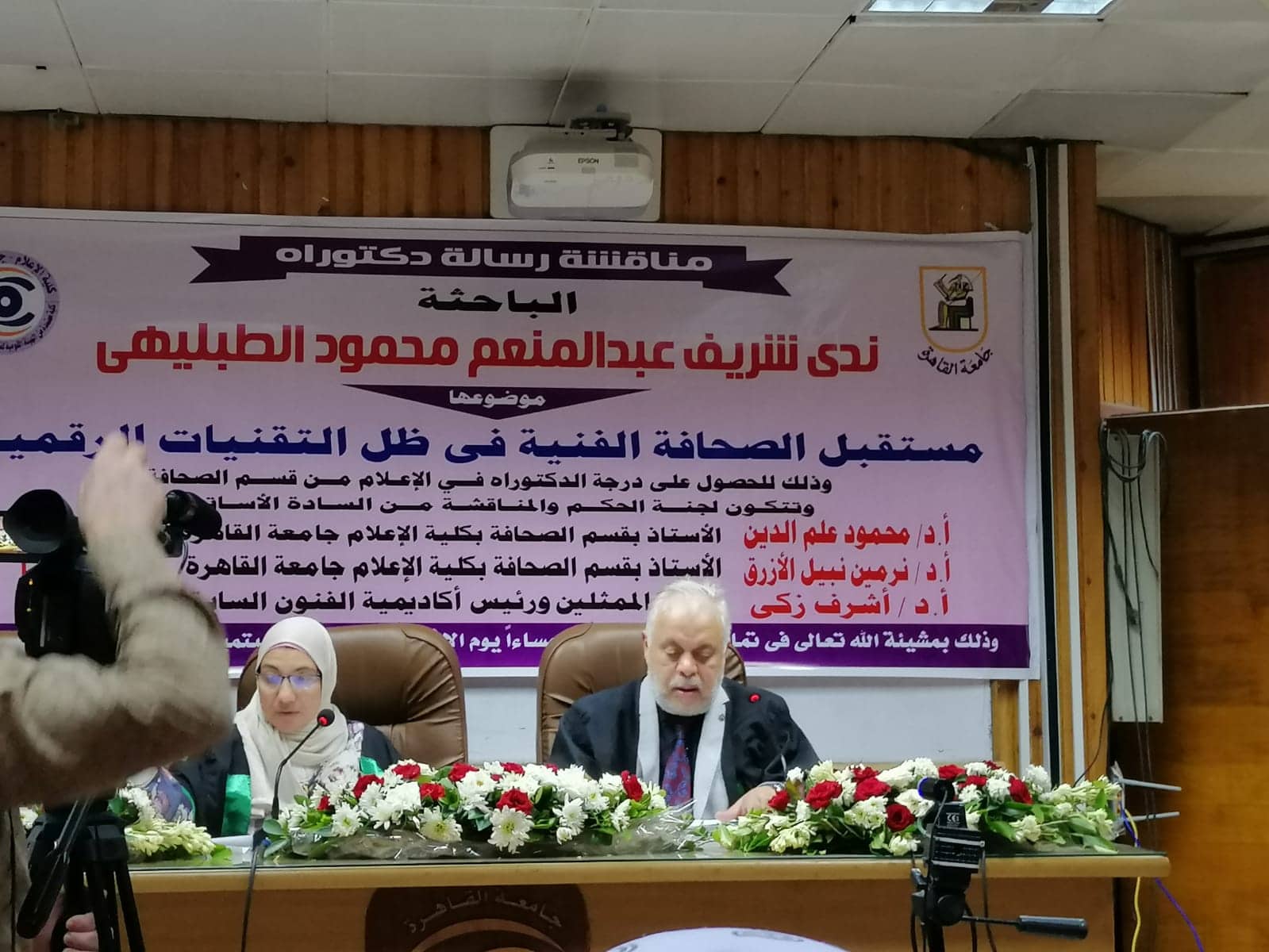 وتواجد أشرف زكي في كلية الإعلام جامعة القاهرة، لمناقشة رسالة دكتوراه الباحثة ندى شريف عبد المنعم محمود الطبليهي، عن موضوع مستقبل الصحافة الفنية في ظل التقنيات الرقمية، في وجود أستاذين من قسم الصحافة مع نقيب الممثلين أشرف زكي ليناقشوا ذلك الموضوع.