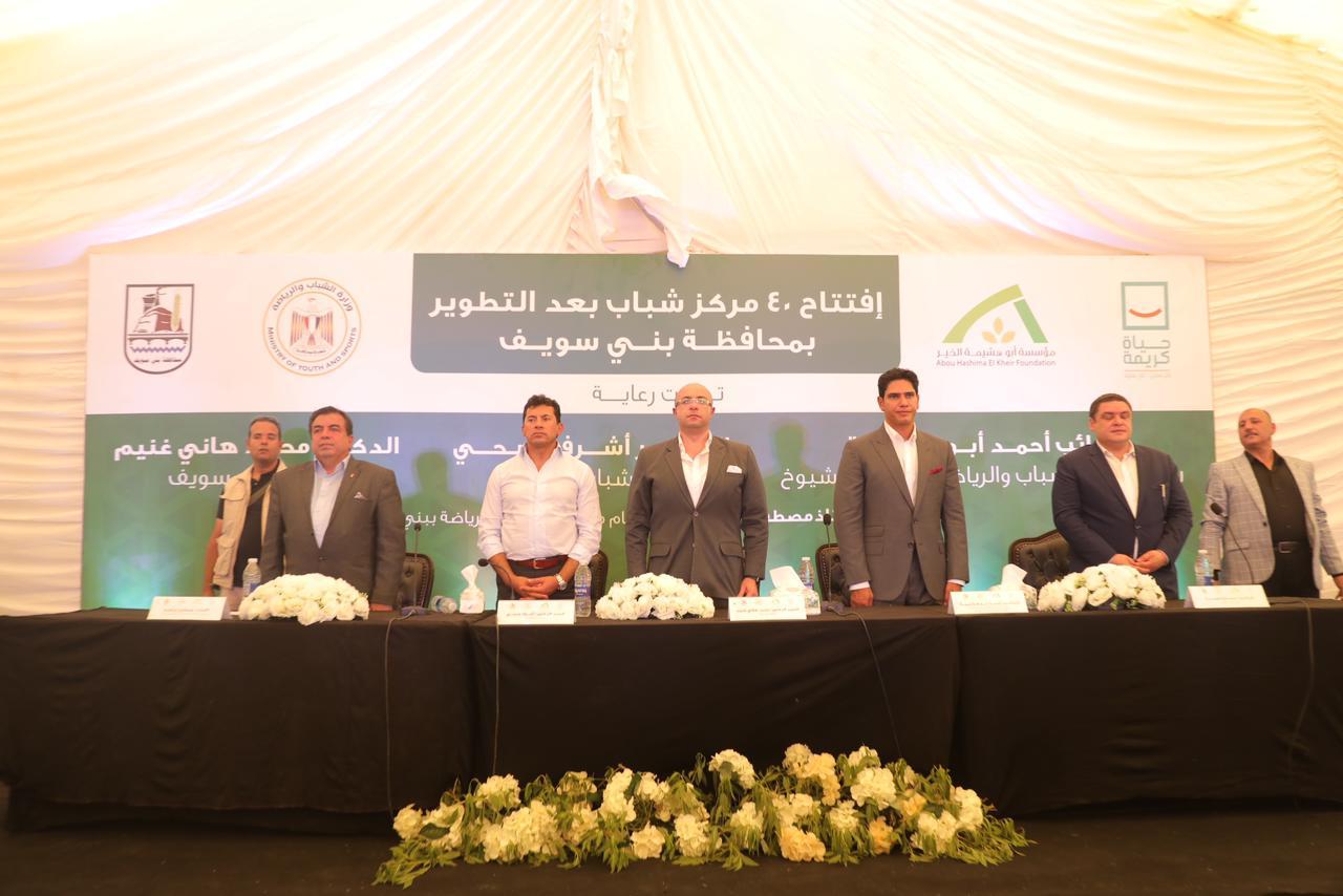 افتتح الدكتور أشرف صبحي وزير الشباب والرياضة والنائب أحمد أبو هشيمة رئيس لجنة الشباب والرياضة بمجلس الشيوخ، والدكتور محمد هاني غنيم محافظ بني سويف ٤٠ مركز شباب بمحافظة بني سويف بعد تطويرهم وإعادة إعمارهم وتجهيزهم بالأدوات الرياضية ومستلزمات صالات اللياقة البدنية وحمل الأثقال، تنفيذا لبروتوكول التعاون الذي وقعته وزارة الشباب والرياضة مع مؤسسة أبو هشيمة الخير لتطوير مراكز الشباب بمحافظة بني سويف.