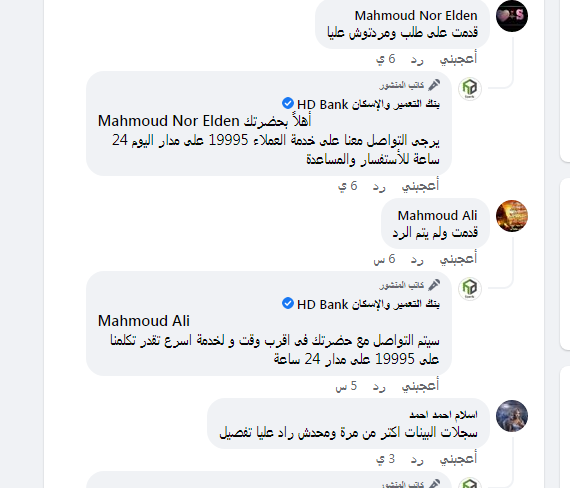 تكررت شكاوى عملاء بنك التعمير والاسكان عبر صفحة المصرف الرسمية على موقع "فيسبوك"، حول عدم رد موظفي خدمة العملاء على الخدمات المصرفية المختلفة، وجاءت على النحو التالي: