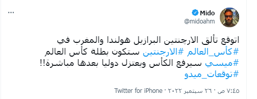 وكتب ميدو عبر حسابة الرسمي"تويتر:" اتوقع تألق الارچنتين البرازيل هولندا والمغرب في كأس العالم، الارجنتين ستكون بطلة كأس العالم ميسي سيرفع الكأس ويعتزل دوليا بعدها مباشرة.