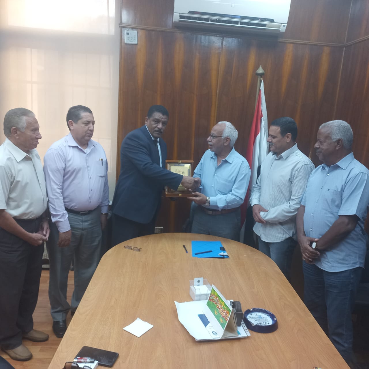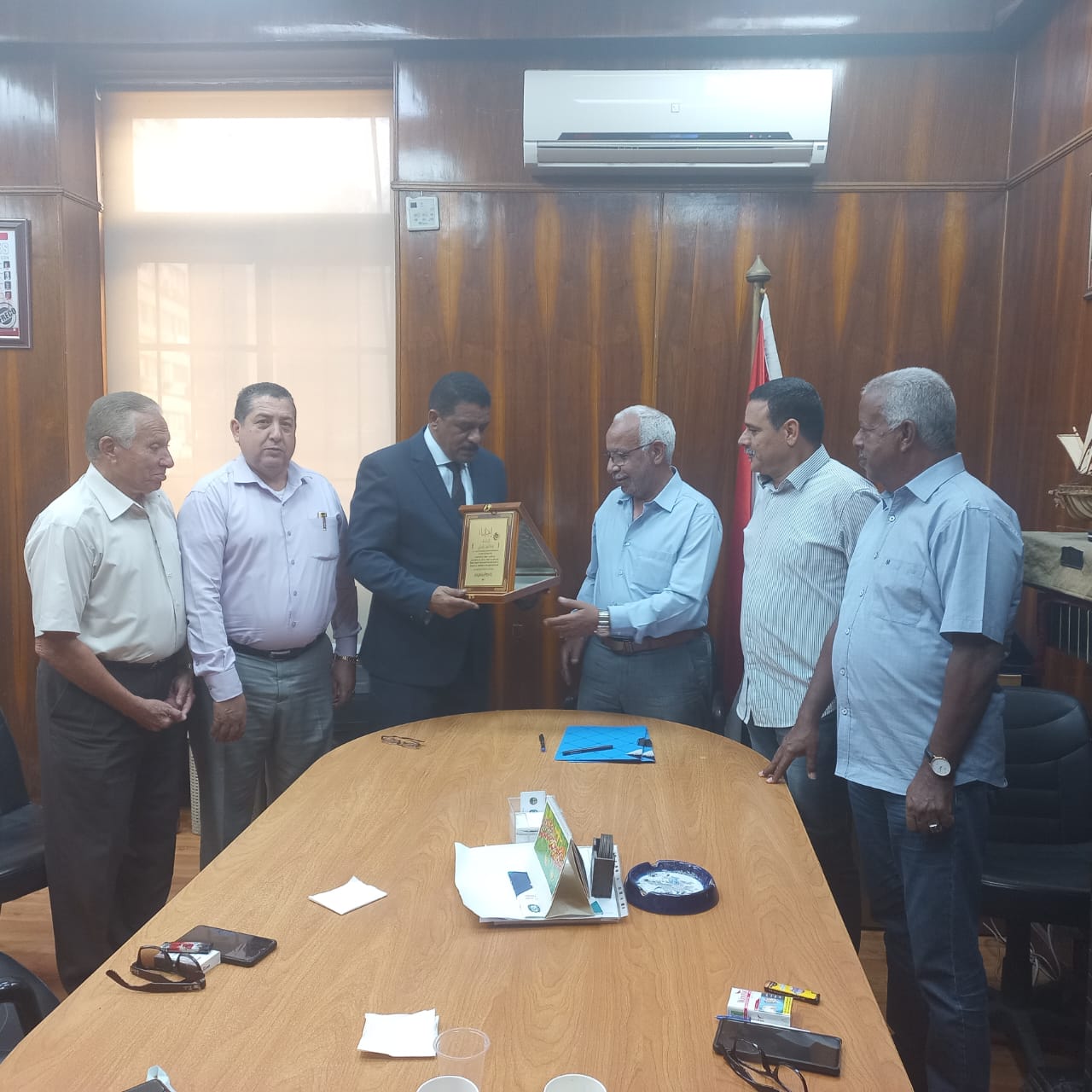 وفي نهاية اللقاء أهدى خليفة سالم البكت، درع نقابة البناء والتشييد في ليبيا، إلى عبد المنعم الجمل، رئيس النقابة العامة للعاملين بالبناء والأخشاب المصرية، تقديرا لدوره في خدمة العمل النقابي العربي والإفريقي.