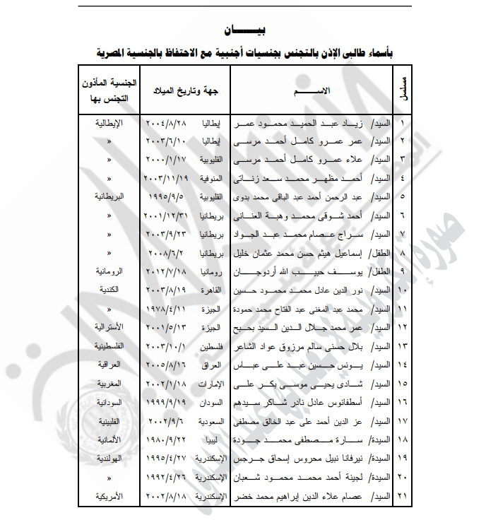 نشرت الجريدة الرسمية، قرار وزير الداخلية، اللواء محمود توفيق، بمنح 105 مواطناً الجنسية الأجنبية، مع احتفاظهم بالجنسية المصرية.