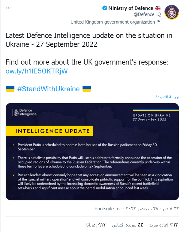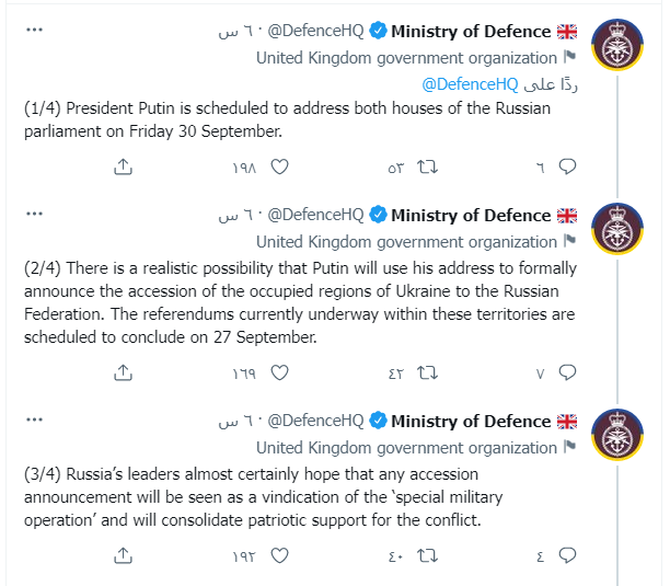 وذكرت الوزارة فى تغريدة لها نشرت عبر حسابها الرسمي على تويتر:" من المقرر أن يلقى الرئيس بوتين كلمة فى البرلمان الروسي يوم الجمعة 30 سبتمبر الجاري، وقد يستخدم خطابه لإعلان رسميا عن انضمام خيرسون ولوجانسك ودونيتسك وزابوريجيا إلى الأراضي الروسية".