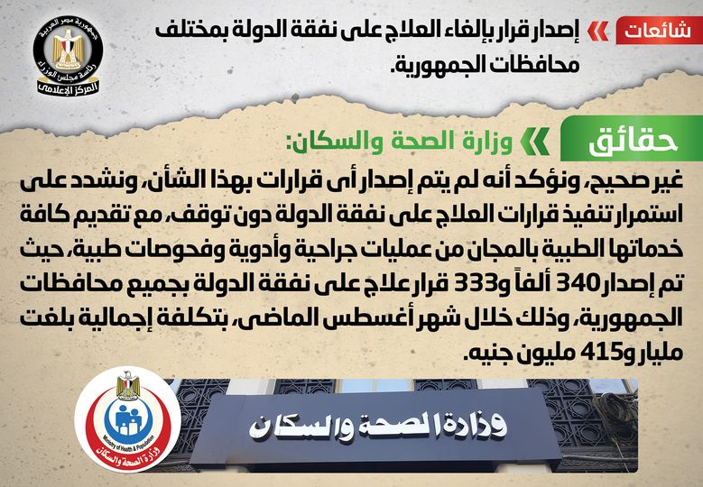 انتشر في بعض المواقع الإلكترونية وصفحات التواصل الاجتماعي أنباء بشأن إصدار قرار بإلغاء العلاج على نفقة الدولة بمختلف محافظات الجمهورية، وقد قام المركز الإعلامي لمجلس الوزراء بالتواصل مع وزارة الصحة والسكان، والتي نفت تلك الأنباء.