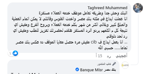 قال أحد عملاء بنك مصر في تعليق عبر صفحة الشركة على موقع "فيسبوك"،: "البنك وحش جدا وطريقه تعامل موظف خدمة العملاء مستفزة".