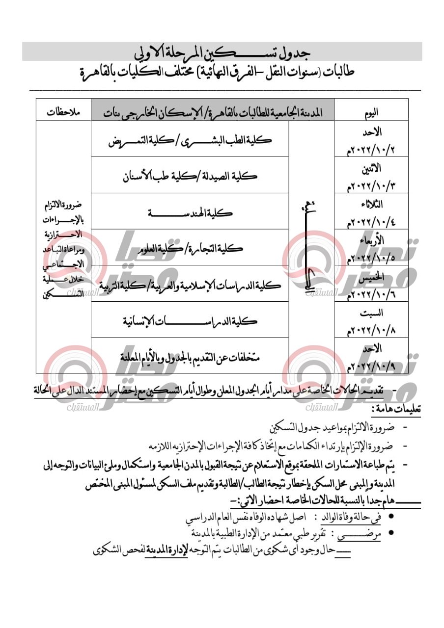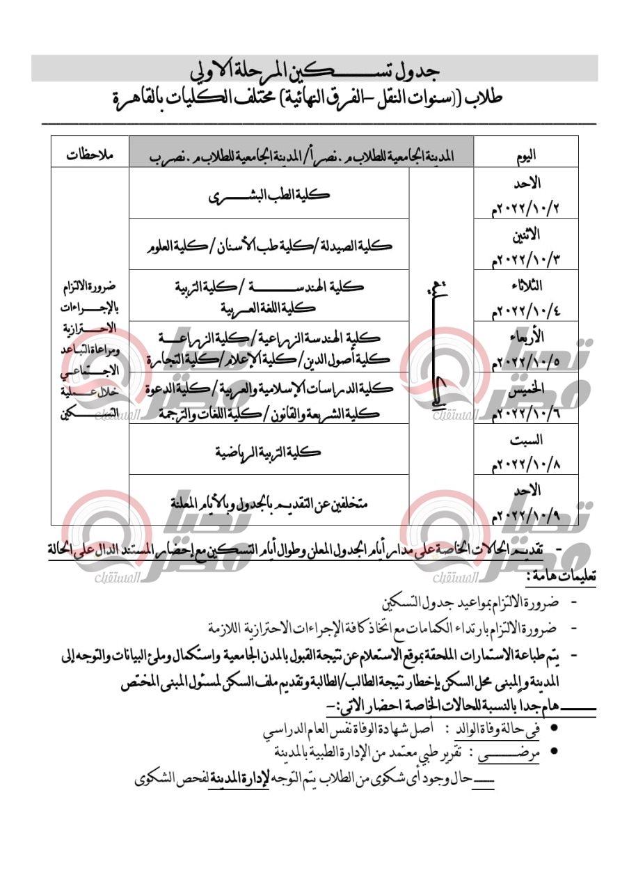 وتبدأ جامعة الأزهر، أعمال تسكين الطلاب والطالبات يوم الأحد المقبل، طبقا للجداول التالية: