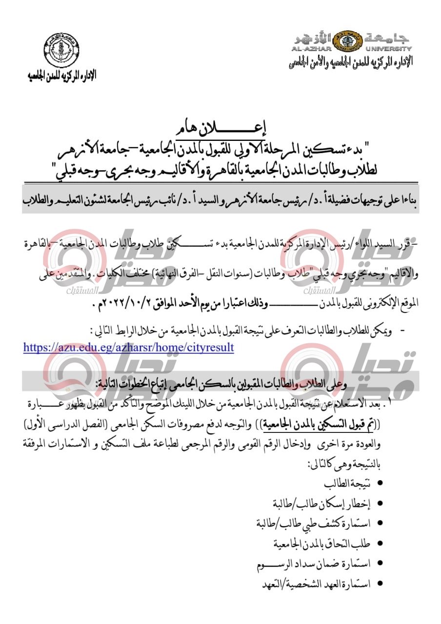 نتيجة تنسيق القبول بالمدن الجامعية بالأزهر