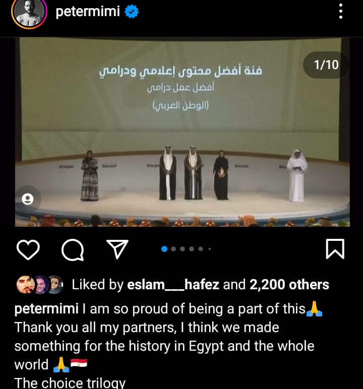 واحتفل المخرج بيتر ممي بهذا الحدث، من خلال نشر مقطع فيديو قصير أثناء تسليم مسلسل الاختيار الجائزة، والتعليق عليها: “أنا فخور جدًا بكوني جزءًا من هذا شكراً لجميع شركائي ، أعتقد أننا صنعنا شيئًا للتاريخ في مصر والعالم بأسره”.
