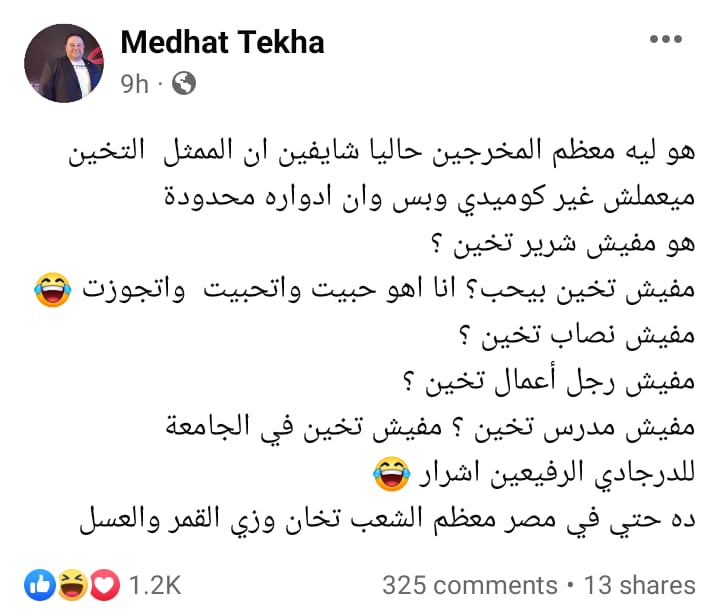 وقال مدحت تيخا عبر فيسبوك: هو ليه معظم المخرجين حاليا شايفين ان الممثل التخين ميعملش غير كوميدي وبس وان ادواره محدودة، هو مفيش شرير تخين ؟ مفيش تخين بيحب؟ انا اهو حبيت واتحبيت واتجوزت.