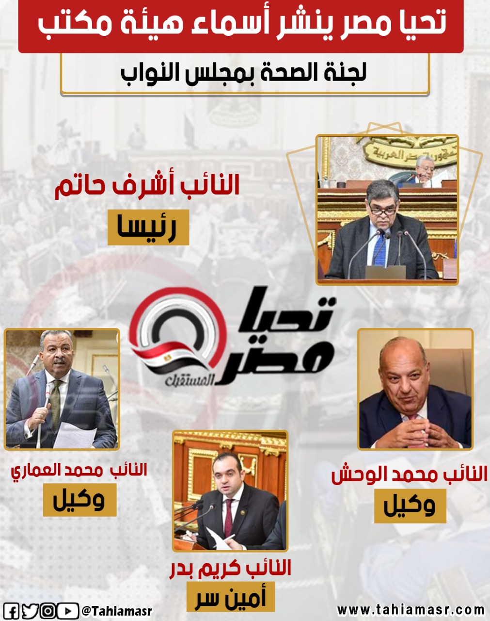 وطبقا للمصادر الخاصة بموقع تحيا مصر، تم التوافق علي أن يكون الدكتور أشرف حاتم، رئيسًا، وكل من النائب محمد محمد زكي محمد الوحش ، وكيل أول، والنائب محمد العماري وكيل ثانى، والنائب كريم بدر حلمي رزق الله ، أمين سر.