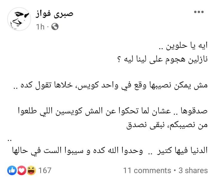 كتب صبري فواز عبر حسابه الرسمي بموقع التواصل الإجتماعي “فيسبوك”: “ايه يا حلوين .. نازلين هجوم على لينا ليه ؟ مش يمكن نصيبها وقع في واحد كويس، خلاها تقول كده صدقوها .. عشان لما تحكوا عن المش كويسين اللي طلعوا من نصيبكم، نبقى نصدق الدنيا فيها كتير .. وحدوا الله كده و سيبوا الست في حالها”.