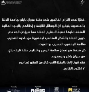 نظرًا لعدم التزام القائمين على حفلة مروان بابلو بجامعة الدلتا بالمنصورة بتوفير كل الوسائل اللازمة، وإخلالهم بالبنود المالية المتفق عليها مسبقًا لتنظيم الحفلة ماا سيؤدي إلى عدم خروج الحفلة بالشكل المناسب لجمهورنا من ناحية التنظيم، سلامة الجمهور، المسرح، الصوت.