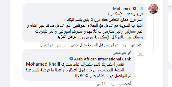 قال أحد عملاء البنك العربى الافريقى عبر صفحة المصرف على موقع "فيسبوك"،: "فرع رشدي بالإسكندرية أسوأ فرع ممكن التعامل معاه فرع لا يليق باسم البنك".